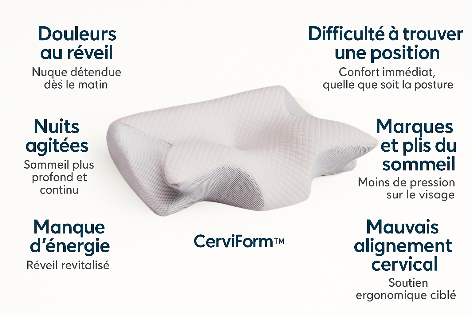 Je me réveillais chaque matin avec la nuque bloquée. Après une semaine avec CerviForm™, plus aucune douleur. Je dors plus profondément, je bouge moins, et je me sens reposée dès que j’ouvre les yeux. C’est de loin le meilleur oreiller que j’ai testé.